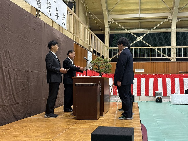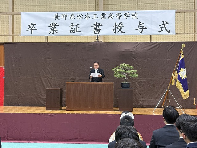 卒業式では平林会長より祝辞を頂きました。副会長の皆様にもご参列を頂きました。また、全国大会などで入賞するなどの活躍をされた生徒電気科吉田さんへ、平林会長より「同窓会長表彰」が行われました。(R6.3.2)