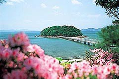 長さ387メートルの橋で陸地と結ばれている蒲郡のシンボル「竹島」。