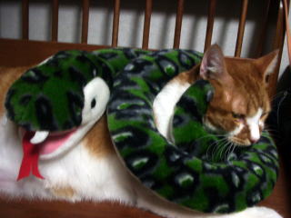 | 10月20日 | う・・・苦しい・・・あぁいたずらが過ぎましたかぁモーちゃん。 首に巻き付 いているのは息子さんの蛇のぬいぐるみ。だけどモーちゃん、逃げたりせずしばらくこのまんまの体勢で寝ていました♪でもあんまりいじめちゃダメだよん(ごめんなさい)。 |