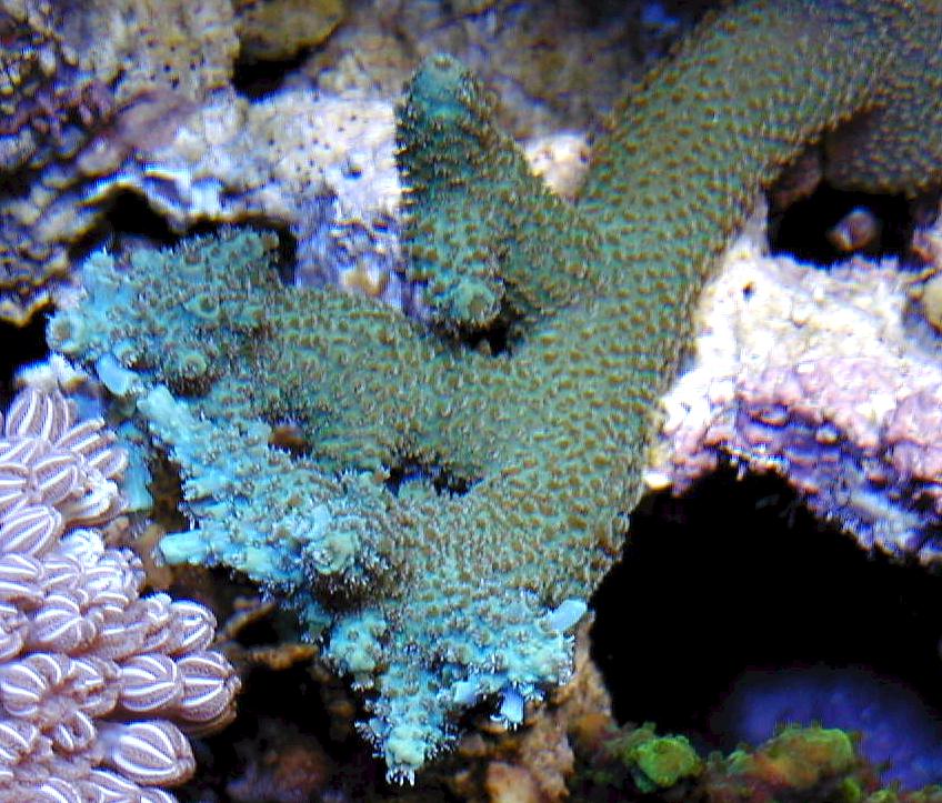 スギノキミドリイシに似ますが、側面polypはずっと小さくみえます。左下先端は水面に近づき、たくさんの中軸polypを分岐させ、青みが強くなったところです。水槽に入れ立ては、写真の上の枝のようでした。