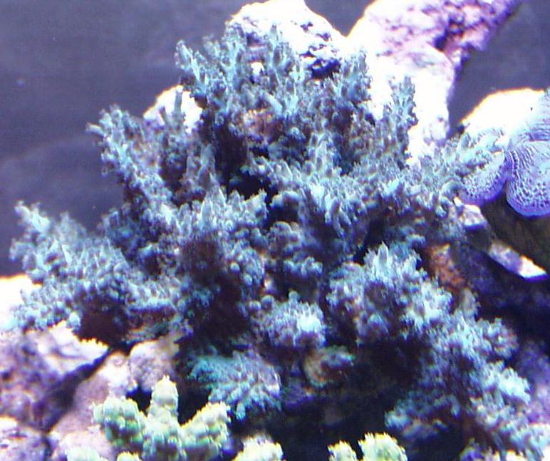 購入時は枝1/3が少々水色がかっていました。やがて、全体が茶色になってしまったのですが。Bタンクのプレナムにライブサンドを使用してから、全体が水色化してきました。時を同じくして、小さいハナヤサイも茶色から、ピンクになりましたので、ライブサンド効果かも知れません。ただ、どのような変化が水質に生じたのか今のところ説明できません。
