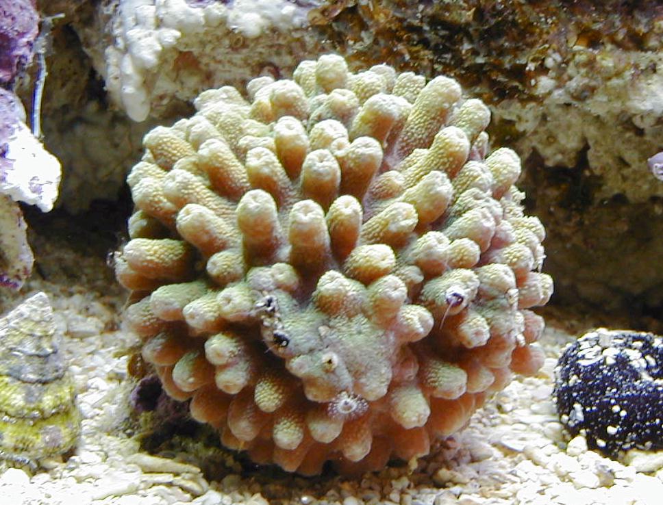 褐色、緑褐色の半球形状群体、アナサンゴの中では莢が大きく突出する。