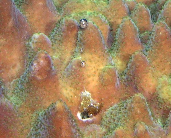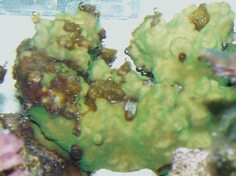 その後、それまでも少量、出たり消えたりしていた、半透明のスポンジ状のコケが常時出るようになりました。初めの2,3週はそれも目立たず、サンゴにも異常なかったのですが、やがて、このコケが茶色味を増し、徐々に増えてくると、サンゴの色合いが幾分か褪めたようになりました。3月6日にCaReaktorを設置し、それが軌道に乗りKHが上昇(6→8)してくると、このコケのBloomingが始まりました。水槽のあちこちに飛び火し、そこで1日で成長が分かるほどの増殖速度を示し、光合成の酸素を沢山付け、一部鼻水状の気泡粘液が出てきました。(スポンジ状・半透明→トロロコンブ様・薄茶色→鼻水状・気泡発生)