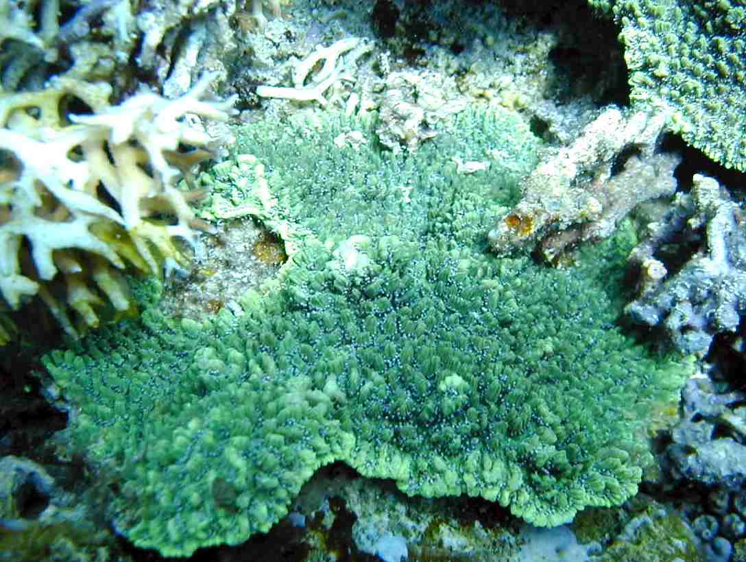 サンゴ同士の戦い、左上のコモンサンゴはミドリイシに負けてめくれています。