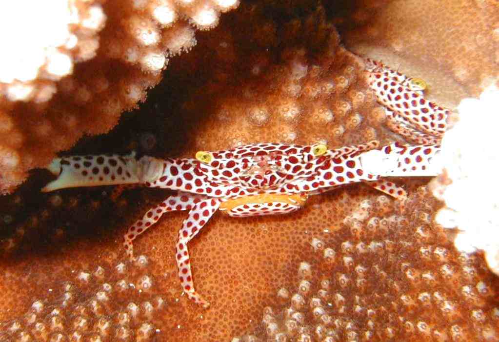 次は同じサンゴに住み着くカニでも潜り込んだまま出てこないカニ、サンゴの防衛義務を果たしているのだろうか?