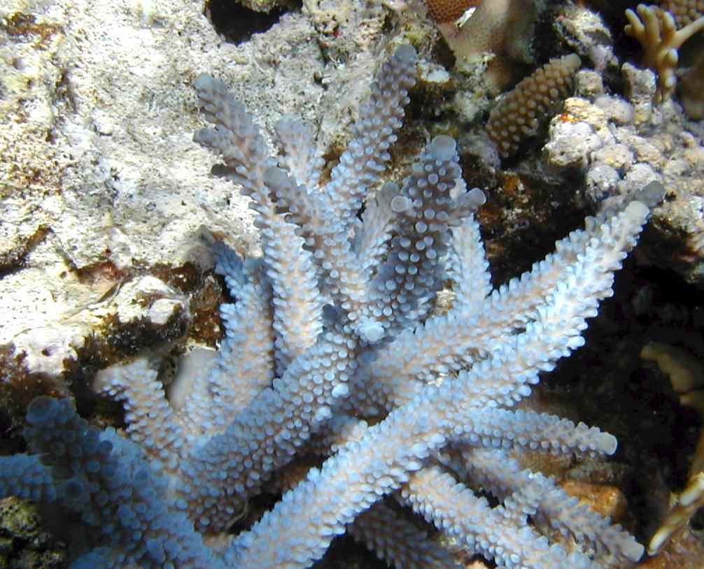 次はスギノキタイプのミドリイシがつくるブッシュ、ベージュとブルー系が半々。