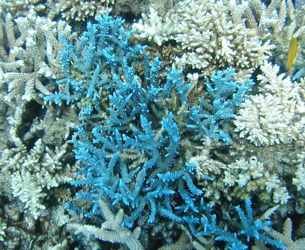 典型的なテーブル状ミドリイシ、再生部分は青みを帯びます。