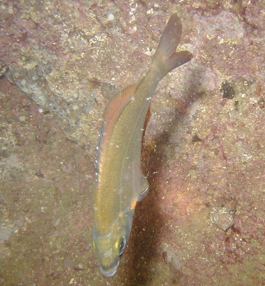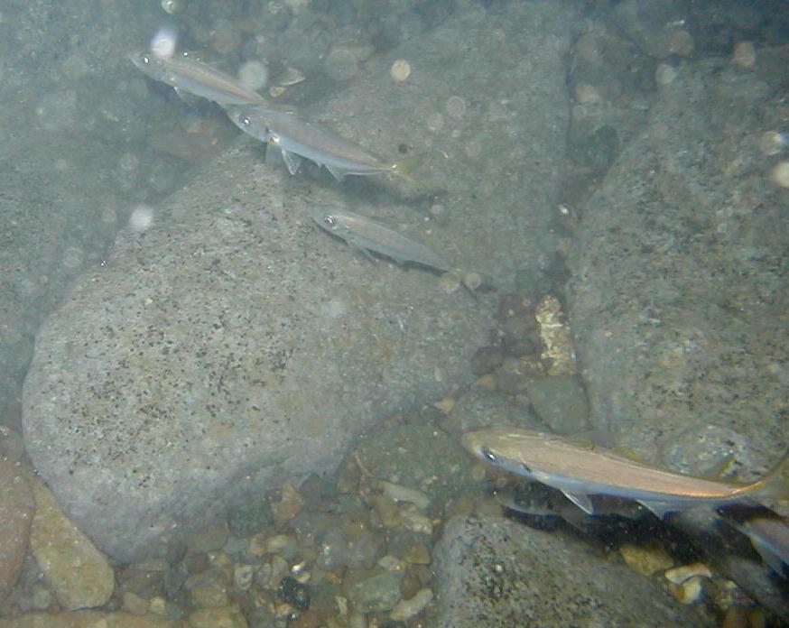 アジなど遊泳魚は岩の下に入ったりせず、水中空間に群で浮かんでいますが、背中が赤っぽい夜間模様になっています。