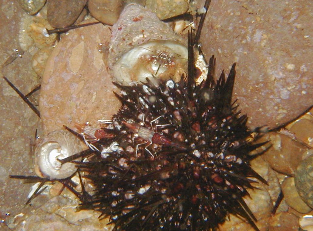 何が原因か、命を落としたウニに群がるヤドカリとエビ、エビはサラサエビRhynchocinetes uritaiの仲間(同属)と思いますが、模様は異なります(胸部が白い)。近縁種かサラサエビの幼体でしょうか?