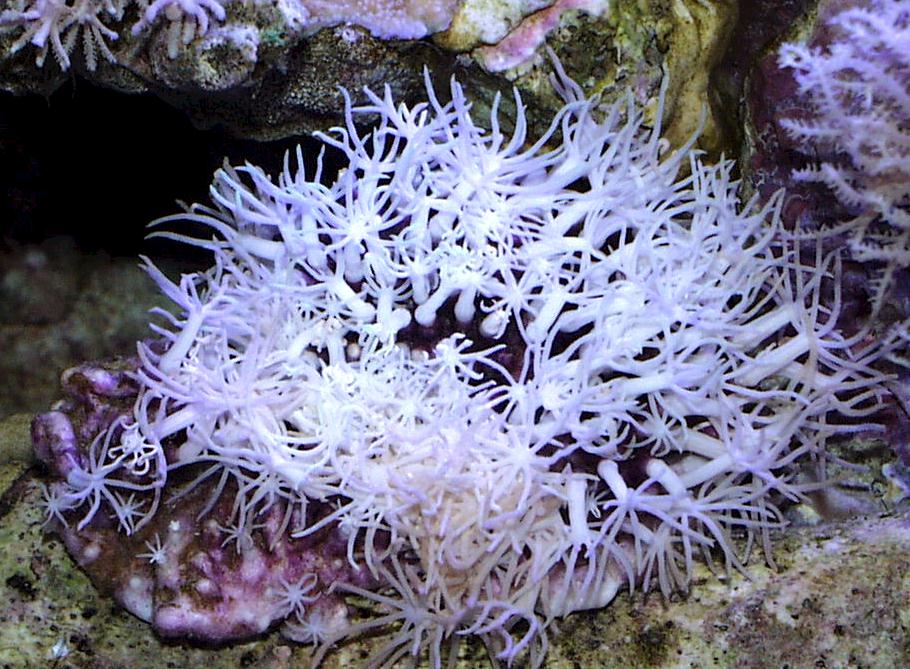 スターポリープは成長が早いが、水槽飼育で、2,3年立つと最初の部分が消退してくることがある。小石にでも成長部分を這わして、元の所の「ハゲ」にあてがうパッチを作っておくと良い。