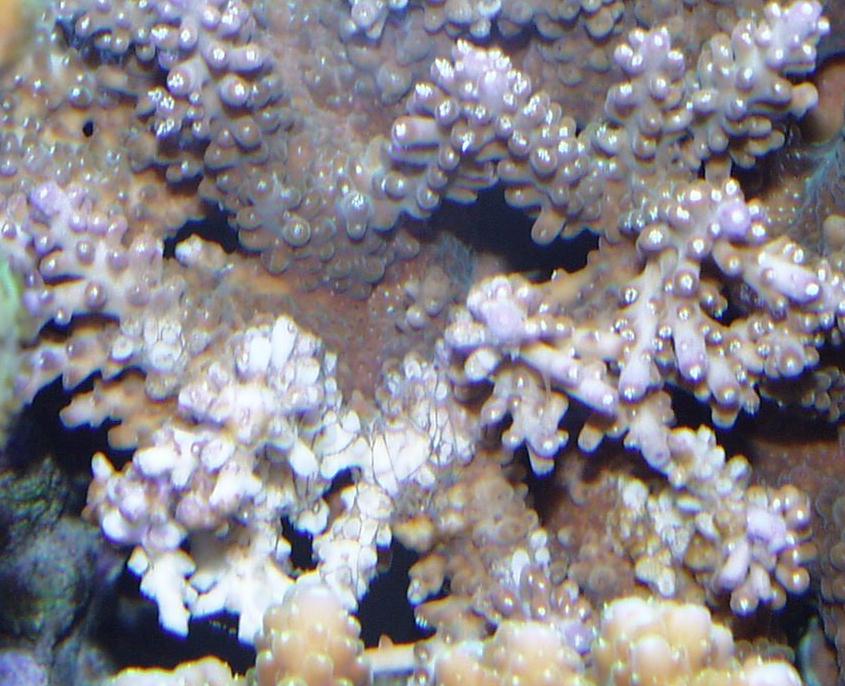 ミドリイシの日陰部分に、小さい白点が出たり引っ込んだりします。夜間に広がり、照明中は広がりにくい、あるいはもどります。光量不足の白化に似ていますが、この広がったり、引っ込んだりが異なるところです。この時点では、治療、条件によってはまだ助かる可能性があります。