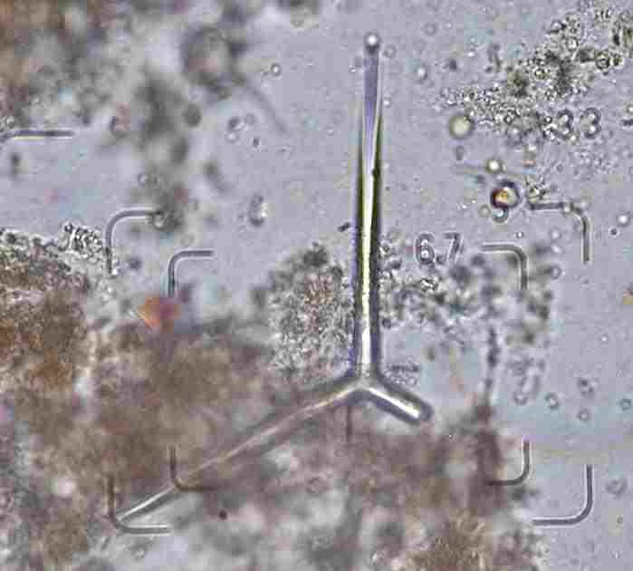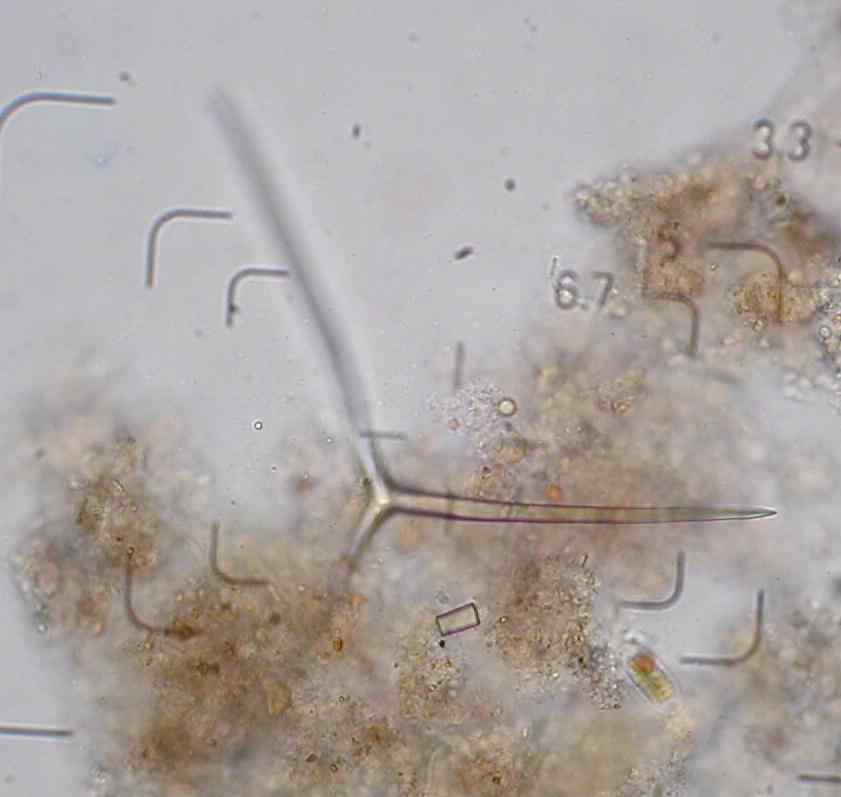 Table1のaは針状結晶とデトライタスの400倍像です。結晶はこのようにベンツ状の形をしているものが多く見られました。デトライタスは強拡大しても構造が認められず、破砕物と思われます。いぜん、「UK」をアルコールで抽出し、濾紙に吸わせたところ、はっきりしませんでしたが、対象とした植物すりつぶしアルコール抽出物と同じバンドになり、クロロフィルなどの植物色素が主と思われました。デトライタスの「茶色は」藻類色素が多く含まれていると思います。