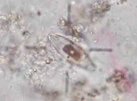 Table2のaはDD「UK」のデトライタス100倍像です。デトライタスの質感はBSでもDDでも同じですが、BSでは沢山含まれていた球形藻類がほとんど認められませんでした。BSでは100倍で一視野に数個はあるのが、DDでは一視野に1/10個ほどの少なさです。bは見つけた球形藻類の400倍像