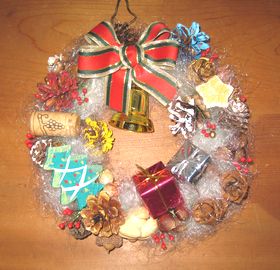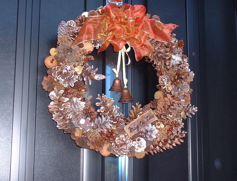 ちょっと大き目お店用リース 自然の素材は松ぽっくりしか使っていません。 ありきたりのリースで申し訳ないのですが いつもお世話になっている上野幌薬局さんの お店用に作りました。 (60p×60p) |