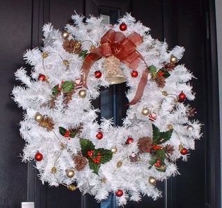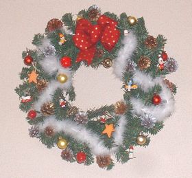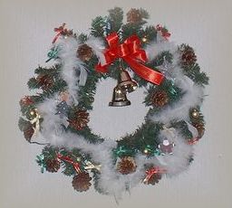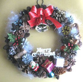 | 我家のクリスマスリース 昨年作ったものをリサイクル。 リボンをボリュームアップ。 ベル・オーナメントを入れる。 ちょっと地味です。 まっ イイか! 42×42 |