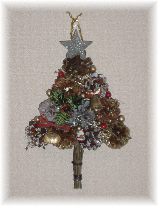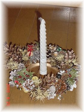 モールのクリスマスリース お世話になっている近所の美容室に飾ります ドアの外に飾ってもいいように 100円均一のモールの台を使ったので 安っぽい感じになったかもしれません。 (ゴメンネ・・・) 材料 モールのリース台・松かさ・オーナメント・ リボン(金星入りの赤の布地で製作) 42cm×42cm |