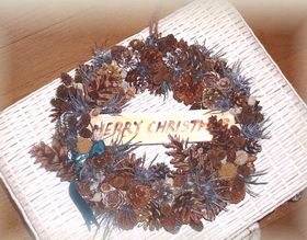 松ぽっくりとエリンジュウムのリース スタイロフォームのリース台に松ぽっくりを 挿して作ったシンプルなリースです 材料 ストロープ松・カラマツ・エリンジウム・ プラタナス・ハクウンボク・・・江別 はんの実・・・千歳 松かさ・・・札幌 28p×28cm |