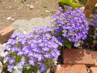 | ミヤコワスレ・・・紫・薄紫・ピンク よく増えます ?・・・草丈10cmに満たない小さなハーブですが名前がわかりません。後ろはタイム。 |