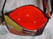 | 派手な幾何学模も着物地です。↑ チョッとシミがありますがこれがイイというので こんな感じになりました。 裏地は日本手ぬぐいを使ってみました。 金色の帆立貝のアクセントも内ポケットに付けました。 27×21 |
