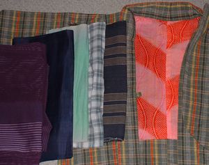 | 最初の店で買った襦袢とはぎれ。 家に帰ってみると大きなしみがあった。 (よく見ないで買ってしまった) はぎれは1枚200円 (後でたくさんゲットしたので買わなくても良かった) はぎれの状態は良い。 |