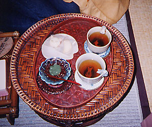 写真10:猫の手白玉よもぎバージョン&クッキー 湯飲みにも猫がいます^^ |