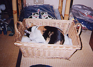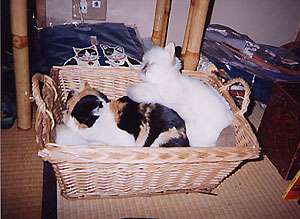 | 写真8・9:にゃんこ、ぬいぐるみに甘えるの図♪ このあとしばらくここで寝ていました。 どれがぬいぐるみなのだ〜?(笑) |