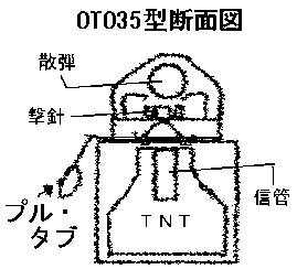 (右図)これはOTO35型の断面図、プル・タブを引くとセフティプレートが抜け、弾頭内の撃針に接触可能となる。投げれば弾着のショックで爆発する仕組みになっている。ということは簡単に説明すると『よく駄菓子屋とか懐かしのおもちゃ屋などでうっている投げると爆発するロケット』と原理は同じなのではないのだろうか?イタリアファンの方、詳しい情報をお寄せ下さい。 ![]() こういうのありましたよね? |