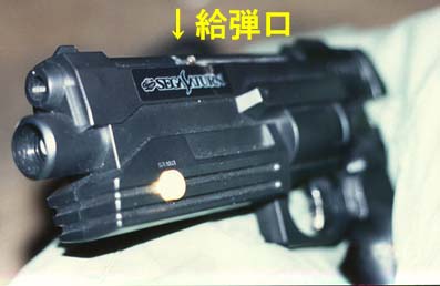 前から見たバーチャガン「改」矢印部分からスプリング給弾される。 画面の外でトリガーを引いても給弾されないぞ! ちなみに内部ユニットはマルゼンのガスガン。