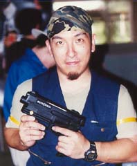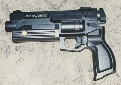 収集場所:タクティクスフィールド(ゲーム場) 収集時期:1998年 「なんでぇ、セガサターンにつける銃じゃないか?」と思った人も多いだろうがこれはれっきとしたカスタムガンである。 よく見るとグリップの下からフロンガスのガス口がのぞかせている。これはなんとエアソフトガンに改造されたバーチャガンなのである。 普通、バーチャガンを分解してお気に入りのエアガンの中に入れるなんてぇのは時々聞きますが、その逆をいった意表を突いた作品といえる。