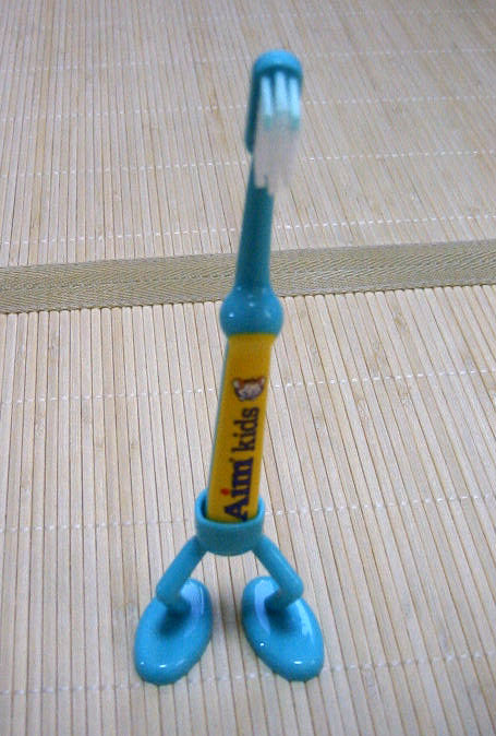 | 2足歩行型ハブラシ 2002/04/26 下の『カレーくうか?』と一緒に撮ったのすっかり忘れていました。以前いた会社の人にアメリカ土産としてもらったものです。 |