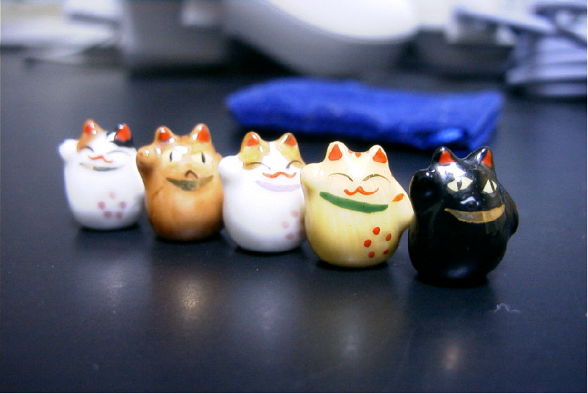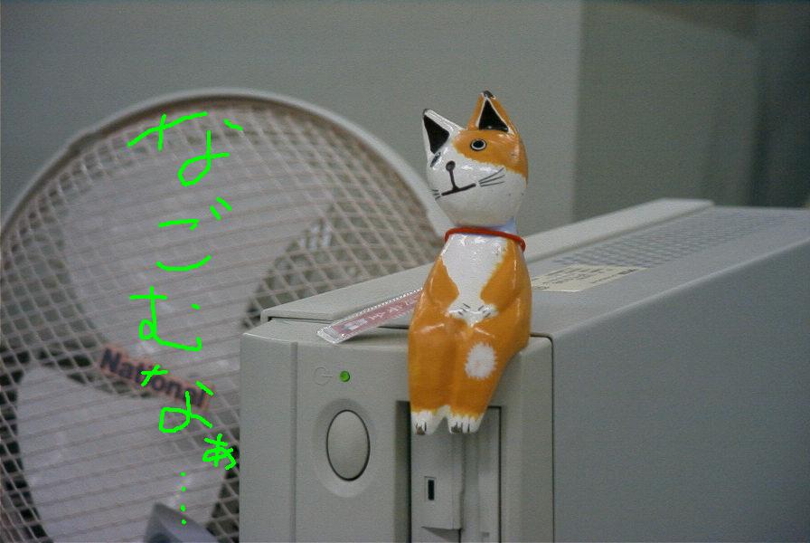 | 交通安全猫 2001/09/16 お土産でもらった猫です。首からかけているのは交通安全のお守りです。ちょっと前まで自宅の本棚に鎮座していましたが、最近は会社のPCの上で和んでもらっています。 |
