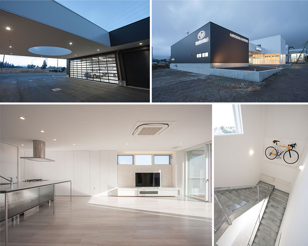 雄大な富士山の麓に建つ自動車整備工場&住宅の重量鉄骨造の建物です。 ダークブラウンの整備場棟とホワイトの事務所棟ブロックを丸く穴の開いた ピロティーでつないだミニマルデザインの計画です。