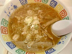 | まず1軒目「旭川・蜂屋」。とんこつベースの縮れ麺。ここの特徴はなんといっても‘焦がしラード’インパクト強し。 | |