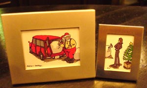 | 【 メリークリスマス♪ 】 横浜にいるぴっこり@義兄からぴっこり@姉に この2つのフレームが届いた。 左:サンタがトラヴェラーにプレゼントを詰め込んでいる。 でもなにやら困り顔・・・ 右:ぴっこり@姉が「もっと詰め込んで〜」と指示(笑) さすがイラストレーター。いいよなぁ〜、 描いて欲しいなぁ、僕にも。 まっ、右のフレームが僕に見えなくもないが(笑) ホントは、サンタクロースが 「お!こんなところにいい車あるやん!貰っていこう!」と トラヴェラーに荷物を積んで盗もうとしているところを、 ぴっこり@姉に見つかり『なにしてるねんっ!』と 怒られる・・・というイラストだそうだ(笑) |