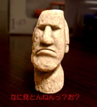 | 【 横浜みやげ? 】 横浜に行ってきました。中華街でコイツを見つけてしまった。 ・・・っていうか目が合った(笑) 全長3cmほどのモアイです。 しかしなんで中華街でこれなんやろ・・・買ったの・・(笑) |