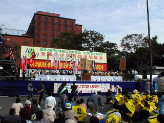 最後に参加者全員で元気良く『がんばろう三唱』を行った後、代々木公園に向かって大デモ隊が東京狭しと行進し、幟旗やプラカード、シュプレヒコールなどで大いに市民にアピールしました。