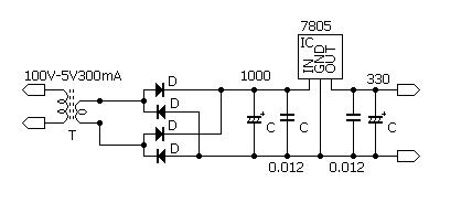 300mAでなくても構いません。2次側は5Vですが無負荷で9Vくらい出ますので7805のINで9V程度です。 |