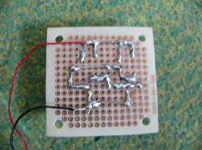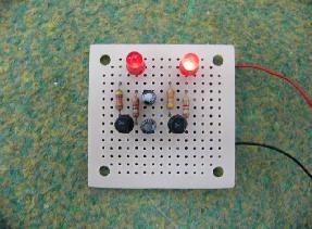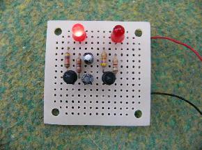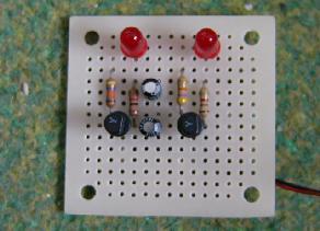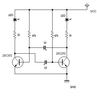 | 製作: 回路が簡単なのですぐに作れます。ただ、デシダル回路の実験用にしたかったので目で追えるようにパルスの周期を遅くしてあります。(オシロスコープが欲しいで〜す。)LEDは動作確認用で交互にピカピカ光りますからウインカーとしても使えますね。基板は蛇の目を使用しましたが自分で専用基板を作るのも勉強には良いと思います。 2SC372は他の大抵の汎用小型トランジスター(2SC)で間にあいます。 定数は私の好みに合わせていますので47kΩと10μFは適当に替えると良いかと思います。47kΩは極端に小さい値には出来ません。この47kΩと10μFで周期が大体決まります。抵抗が小、容量が小だと早い周期になり抵抗が大、容量が大なら遅い周期になります。 | |||||||||