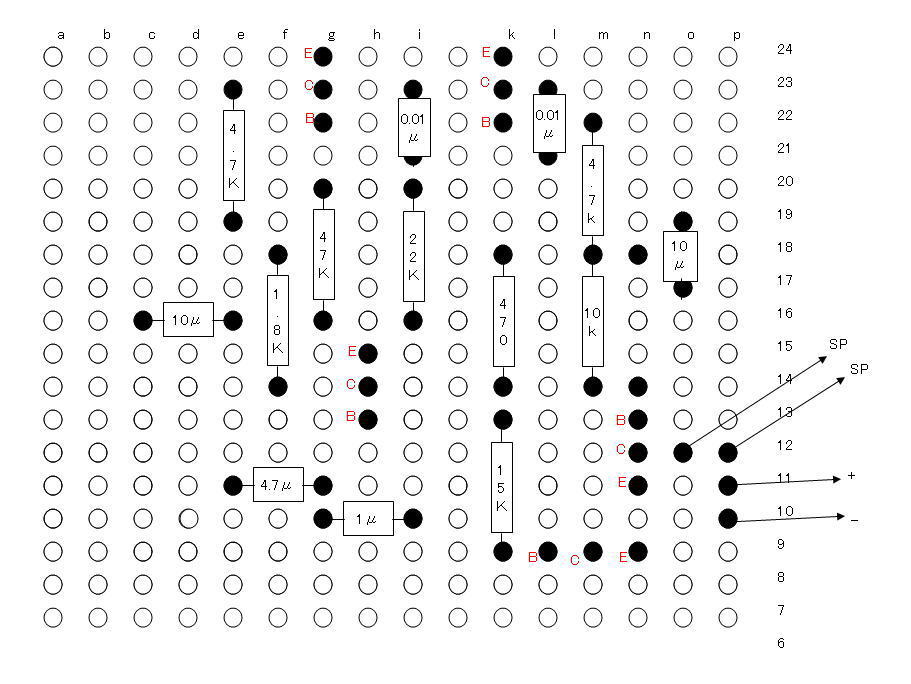 穴あき基盤には下のように番号とアルファベットが書いてありますのでその交点の穴を重ね合わせた生基板に部品をつけます。