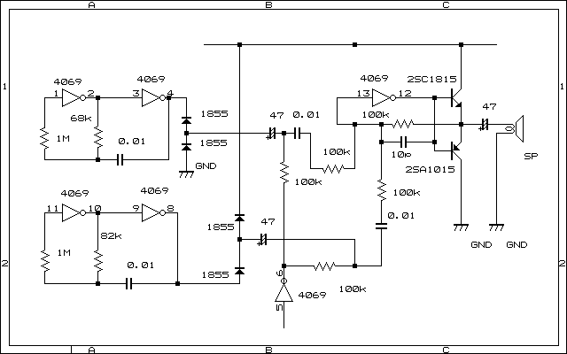 配置図で4番ピンのダイオードアノード側ですがこれは別のダイオードのカソード側とつながりそのダイオードのアノード側はGND(アースまたは接地電源の−側)に繋がっています。4069の11,10,9,8も同様に抵抗の値が違うだけで同じように繋がれています。こうして4069の1,2,3,4でピー音を作成し11,10,9,8でポー音を作ります。4011(前段)から4069の5,6のICでピーとポーを切り替えています。接続している部品を見て配線図ののようになっているのがわかればもうセミプロ並です。