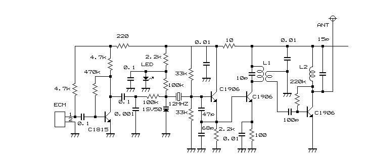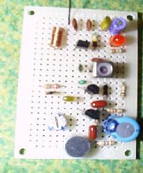組み立ての手順としてどんな電子機器でもそうですが、小型のものからとりつけて下さい。水晶はオーバートーン型でFM帯に波が出るようにね。周波数は送信周波数で決めてね。 熱に比較的弱いもの(半導体など)は最後にします。隣のパターンなどとくっつかないように半田付けは気をつけましよう。 バリキャップで変調させます。 ここにかかる音声電圧で周波数が変わるので周波数変調がかかるのですよ。 向きのあるものや極性(プラスとかマイナスとか かかる電圧の高低)に注意して取り付けて下さい。 電解コンデンサーは回路図にありませんが回路安定の為に電源とアース間に入れて下さい。耐圧は50Vあれば充分ですよ。 コイルは自作します。普通の鉛筆を用意して10回程度巻きます。巻き終わったら鉛筆を取り出し高周波用のニスなどをぬっておきましょう。セメダインなんかでも良いですよ。固定できたら良いんです。 そんなに性能を気にするものじゃないです から。ワハハハ。 くれぐれも高出力にならないように気を付 けて下さいね。 | ||||||||||||||||||||||||||||||||||||||||||||||||||||