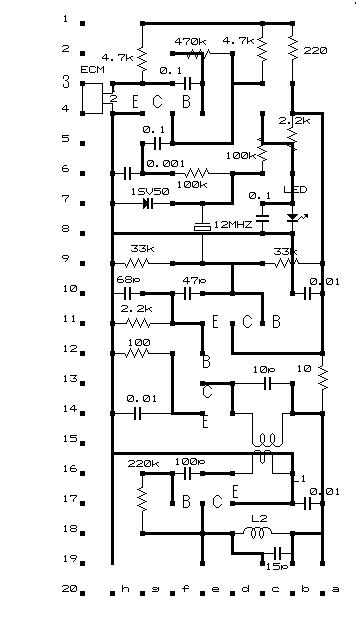 基板図です。穴あき基板にこのように取り付けて下さい。 ただし裏から見た図なので間違えないようにしてくださいね。もう少し横幅を広げると部品が楽につけられます。 そうそう忘れてました(^^;LEDが付いていますがこれは何の為だと思います?答えは電源の安定回路(^^)です。 バリキャップにかかる電圧が変動しては製品品質に関わるのでここで安定化してるのです。 へ?そんなので安定するの?との疑問もあるでしょうがLEDに電圧を加えますと電気が流れて点灯しますよね。電圧が高くなれば明るくなり下がれば暗くなるつまりLEDのアノード側の点は一定の電圧に保たれます。 2.2kと100kの分圧比でバリキャップにかかる電圧は非常に安定して基本周波数変動の少ない良いワイヤレスマイクだと言えます。 出力トランジスターがついていますがこれはパワーをかせぐのが目的ではなくて不要な高調波がでにくいようにしています。 発振が12MHZ帯でその高調波はたくさん出ます。L1,L2で不要な高調波を減衰させることが出来ますのでこの点でも優れています。 マイクは2ピンタイプと3ピンタイプとありますが3ピンタイプなら基板図の縦2.3.4と挿入して2は3と結線するだけで良いですが気に入らんと言う人は1のラインから2のマイクの足と結線すればマイクの出力が増します。 基板図をつけたので空白の部分にいろいろ書きましたが最後に作ってみたけどうまく動作しないからなおしてとか部品を譲ってとかのご期待には沿えませんのでお許し下さいませ。 この回路で実際に2台作りそれなりに動作していますことを報告します。万一回路図や基板図に間違いがありましても責任はとれませんのでお許し願います。 | ||||||||||||||||||||||||||||||||||||||||||||||||||||