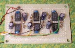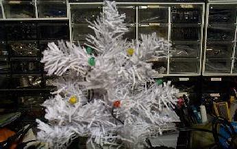 | クリスマスツリーに電球を飾るのが一般的ですが、家庭内で飾るとかなりきらびやかです。明るさは劣りますが、発光ダイオードを用いた電飾にすると幻想の世界への招待状が舞い込んでくるでしょう。 回路はIC555を用いたごく一般的なタイマー回路です。これを6回路用いて(点灯のタイミングをずらしますので普通の電飾ランプよりもなめらかな点滅を致します。)クリスマスツリーとしています。 写真は実験回路ですので穴空き基板を使用していますが実際は専用基板となっています。特に難しいところはありませんが電解コンデンサーやICなどの極性を間違えないで下さい。表示器も6回路分必要ですよ。 以下に必要な部品についてお知らせ致します。 |