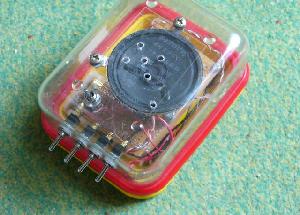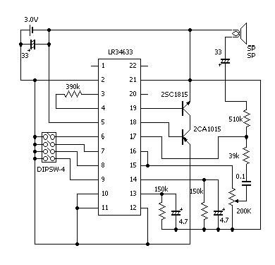 | 大阪日本橋のデジットにてシャープのLR34633と言うサウンドICを見つけました。単体で250円で売られていたので面白そうだなと4個買ってしまいました。 あまり在庫がなかったみたいなのでもうないかも知れませんが興味ある方は問い合わせてみて下さい。 回路は基本通りに作りましたので面白みに欠けますが結構大きな音量で鳴ります。 製作: このICはLR34611と言う1.5Vで動作するICと同じですが、動作電圧が違います。1.5Vでは鳴らなかったり歪みます(当然かぁ) |