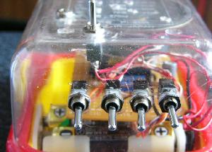 SW(スイッチ)部分は基板上についているSWとパラにケースにも引き出して操作出来るようにして見ました。上のSWは電源用で、手前4つのSWのうち向かって左端はメロディーSWで残り3つが選曲SWとなります。 この3つのSWをあげたり下げたりして選曲(8曲)します。デコードSWを使って8曲をひとつのSWで切り替えるという方法やマトリクスを組んで同じく1つのSWですますなどいずれ改良したいと思います。 下に基板配置の写真を載せていますがパーツも少なく比較的簡単で作りやすいと思いますのであなたも作ってみませんか? | |