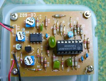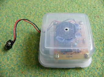 | 組み立ての感想:良く出来た商品ですが初心者にははんだづけし辛いところもあるようです。コンパクトに作られ完成度が高い作品はどうかすれば回路技術者の自己満足で終わらないかと心配です。はじめケースの外に圧電ブザーを付けてみましたが本物なみに音が大きいのでケースの中からグルーで溶着してみました。見栄えは悪いですがしっかりとくっついているようです。ずーっと鳴かせるので電池はやめにして電池スナップに低電圧電源から電池スナップを逆接続したものを用意して電源供給としています。ケースに入っているので音源が特定しにくくどこかでこおろぎが鳴いているといった風情が楽しめると思います。 電子こおろぎの声 | |