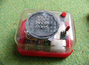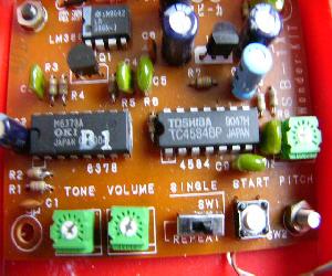 | この製品もデジタル録音再生ICつまり沖のM6378にトンビの音声DATAを焼いてあります。トンビの本当の鳴き声をあまり聞いたことが無いので試行錯誤でtoneの位置を設定しました。 スタートスイッチをケースにつけ電源スイッチもとりつけたら右のようになりました。 音声ICの10番ピンにパルスを加えることにより15番ピンからDATAを読み出すことが出来ます。 |