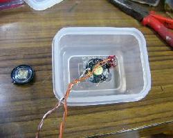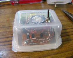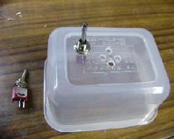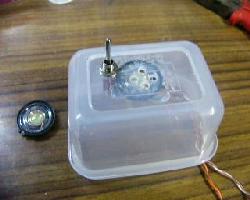 | (3)写真のようなスイッチを取り付けます。日本橋のデジットさんで1個50円でした。 | (4)写真のようなスピーカを取り付けます。携帯用のスピカーみたいです。グルーとか言うものを溶着機でスピーカ周りを流しかためます。 | 中の配線です。スイッチ部分とスピーカにそれぞれ配線します。取り付け前にはんだづけした方が楽かも知れませんがぐらぐらして困るのでこのようにしました。 |