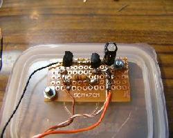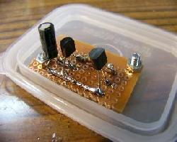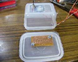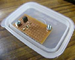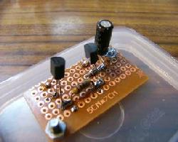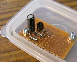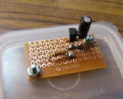 | 蓋の部分に基板を固定します。小さな基板をさらに3分割して使用しました。部品を乗せるのは銅箔面のほうです | メロディーICをとりつけます。3端子タイプの例です。足を穴のひとつおきにつけるのがこつです。こうする事で隣とくっつかず半田しやすくなります。 | この例のICは真ん中の足がVDD(電源のプラス側)で向かって左がマイナス側なのでこの両端に極性をあわせて10μF10wv程度の電解コンデンーを取り付けます |