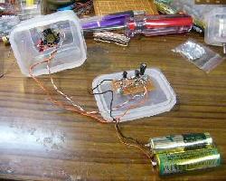 | コレクタからスピーカへの配線、もう一方のスピーカからの配線はプラス電源に。プラス電源のオレンジ線は電池のプラスへ | 電池は単三2個、3ボルトで直接電極部分に線をはんだづけしています。写真は電池の中間配線。 | 電池のプラス、マイナスに線を繋いで全体のテストです。うまく出来たらケースをしめます。 |